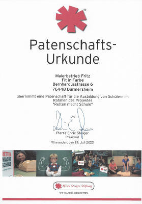 Der Malerbetrieb Fritz hat eine Patenschaft für die Ausbildung von Schülern im Rahmen des Projektes „Retten macht Schule“ übernommen